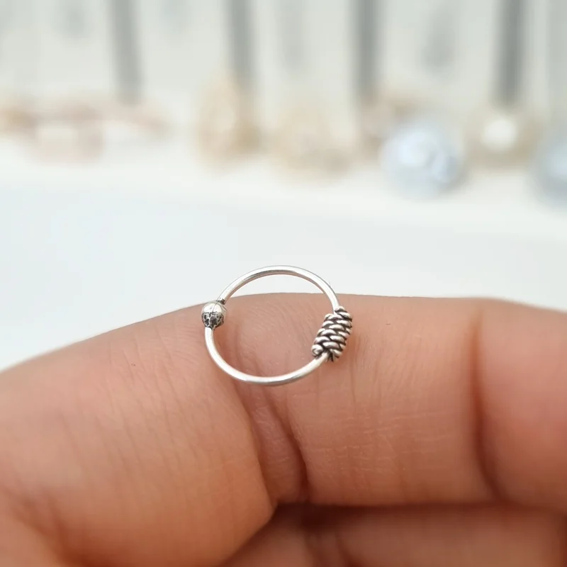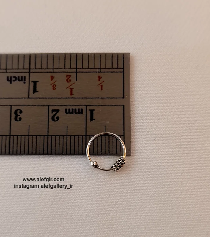 جنس این پیرسینگ بینی نقره 925 عیار است که از بالاترین عیار نقره است و نیز همراه با آبکاری طلا میباشد. پیرسینگ حلقه ای بینی کاری بسیار زیبا است که باید حتما آن را امتحان کنید. نقره بودن این پیرسینگ موجب انعطاف آن شده که باعث میشود راحت تر روی بینی قرار گیرد و اذیت کننده نباشد. این پیرسینگ بینی با بافت سیاه قلم و گویی که روی آن قرار گرفته جلوه ای زیبا را به صورت شما میبخشد. فروشگاه اکسسوری الف منبع پیرسینگ های بینی حلقه ای میباشد و دارای بالاترین تنوع در این زمینه میباشد. همچنین میتوانید مارا در اینستاگرام نیز دنبال کنید alefgallery-ir.