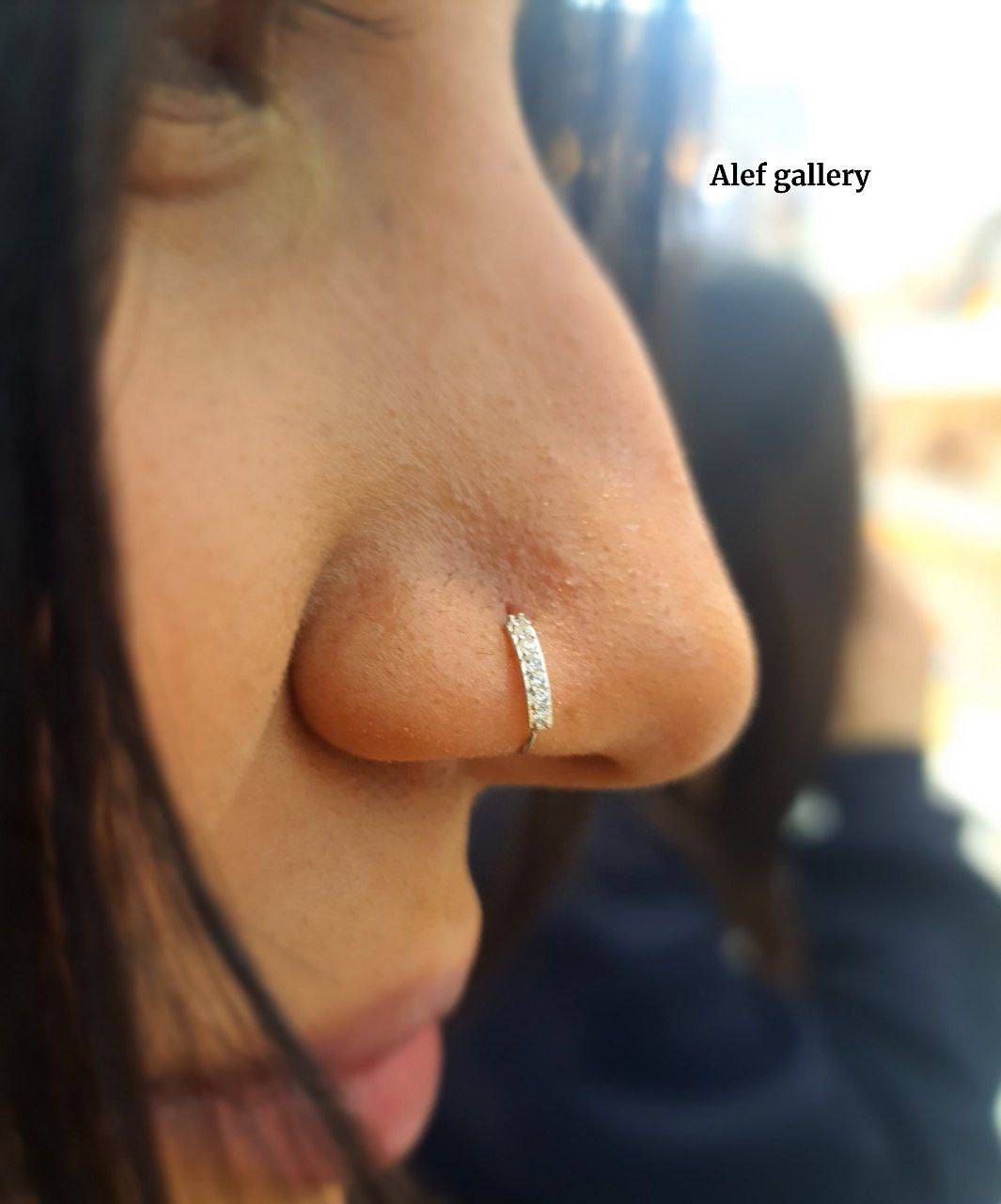 جنس کار نقره 925 است که بالا ترین عیار نقره است و همراه با آبکاری طلا میباشد . نگین های کار شده در این پرسینگ حلقه ای بینی بسیار زیباست و جلوه بسیار زیبایی به بینی میدهد. برای دیدن تنوع بیشتر از پرسینگ های حلقه ای بینی به پیج و اسلاید های دیگر سایت ما مراجعه کنید ALEFGALLERY_IR . ما را در اینستا گرام دنبال کنید. ارسال کار های بالای 235 هزار تومان رایگان است.