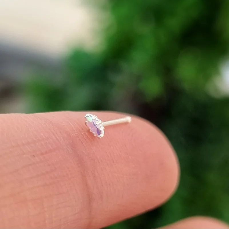 جنس این پیرسینگ بینی نقره عیار 925 است که بالا ترین عیار نقره است و فرم کار میخی است طرح نگین هفت رنگ این پیرسینگ بینی به زیبایی روی بینی شما مینشیند. فروشگاه اکسسوری گالری الف دارای تنوع بسیار زیادی پرسینگ بینی و اکسسوری میباشد و برای دیدن تنوع بیشتر میتوانید به پیج و بقیه اسلاید های سایت مراجعه کنید alefgallery_ir.