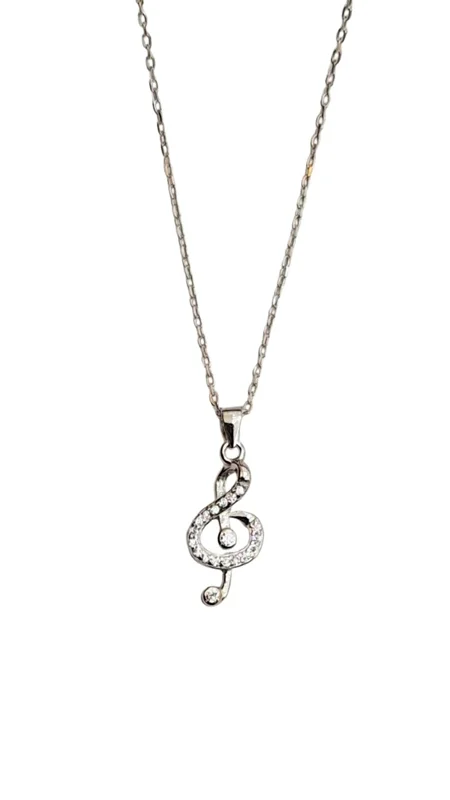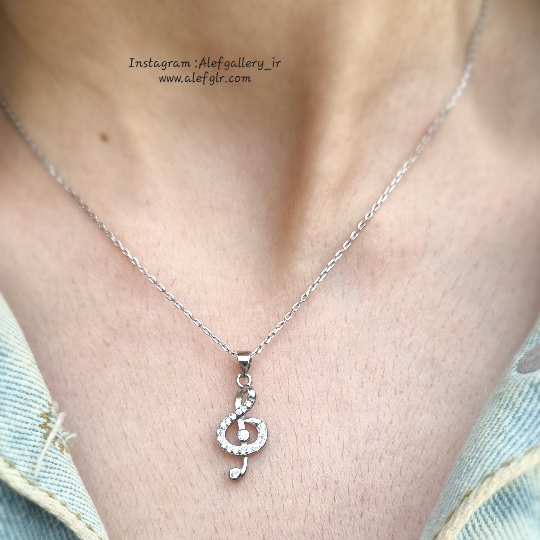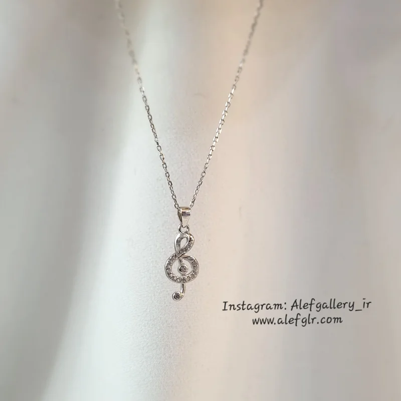 جنس این گردنبند نقره عیار 925 است که بالاترین عیار نقره میباشد و همراه با روکش طلای سفید که باعث ایجاد عدم حساسیت روی بدن میشود و برق و جلوه زیبایی به این گردنبند نقره میدهد. نگین های روی گردنبند کاملا مخراج کاری شده ایند و گردنبند دارای طرح بسیار زیبایی میباشد.نوت موسیقی جلوه بسیار زیبایی روی گردن شما عزیزان دارد. فروشگاه اکسسوری گالری الف به طور تخصصی روی فروش و اجرای پیرسینگ و انواع اکسسوری کار میکند برای دیدن تنوع بیشتر به پیج و اسلاید های دیگرسایت ما مراجعه کنید alefgallery_ir